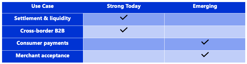 - Integration with legacy systems remains costly, particularly for retail use cases. Widespread adoption will depend on scalable and reliable on- and off-ramp infrastructure.