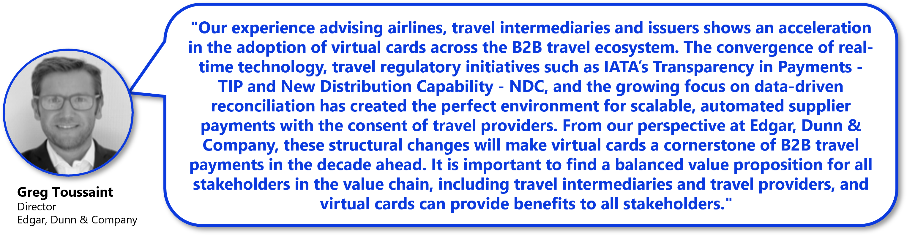 - Fragmented acceptance policies: some airlines still restrict agent-issued virtual cards under Resolution 890 rules. This is often due to the cost of payment acceptance associated with accepting virtual cards: based on our experience, a number of airlines are increasingly migrating away from a binary accept / do not accept policy to a more customised acceptance policy (e.g., acceptance in specific geographies, or in specific channels, or in partnership with specific issuers).The cost of payment acceptance paid by travel providers can hinder the development acceptance network of virtual cards. At Edgar, Dunn & Company, we believe it is key to have a balanced value proposition between travel intermediaries, travel providers and issuers. Virtual cards can bring key benefits to all stakeholders in the value chain and this needs to be discussed and negotiated as part of commercial relationships between the different stakeholders.